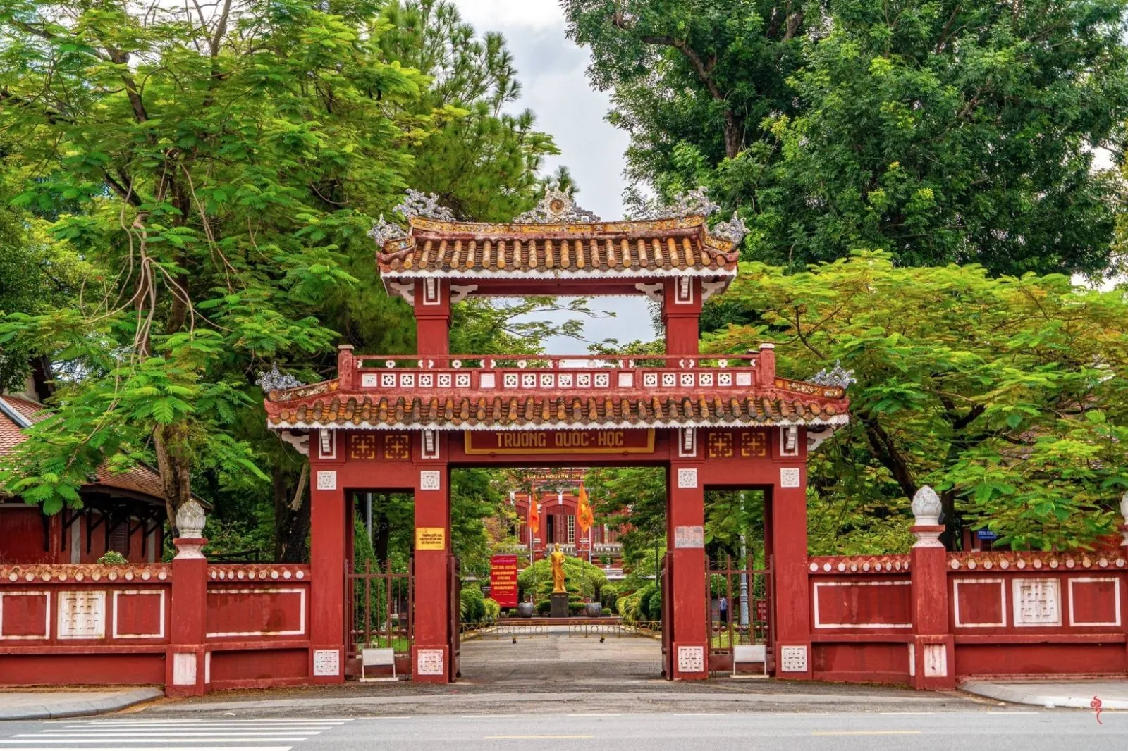Toạ lạc ở số 12 đường Lê Lợi, ngay trung tâm, Quốc học Huế là ngôi trường trung học đầu tiên của Huế xây từ thời vua Thành Thái năm 1896. Bạn nên đi vào buổi trưa như 11h30 và sau 17h để tham quan vì nếu đi vào sáng sớm du khách có thể không được vào trong giờ học của học sinh. Bước chân qua cổng trường, một không gian cổ kính và tĩnh lặng mở ra, tách biệt hẳn với sự ồn ào của phố thị bên ngoài, khiến bất cứ ai cũng cảm thấy bồi hồi như được ngược dòng thời gian về với những giá trị xưa cũ.