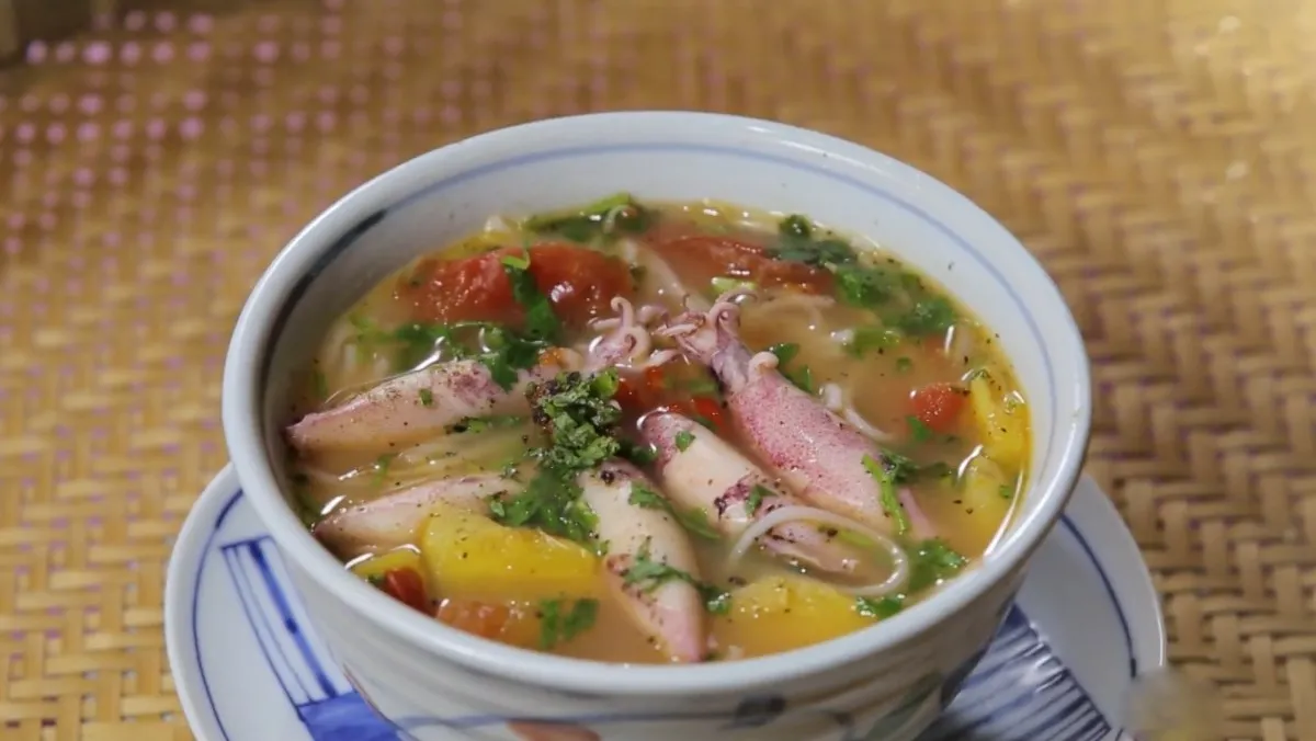 Một tô bún mực bốc khói nghi ngút, điểm xuyết màu đỏ của cà chua, màu vàng của dứa và màu xanh của hành ngò trông vô cùng bắt mắt. Vị chua thanh thoát của món ăn này cực kỳ hợp với những ngày nắng gió miền Trung, giúp bạn giải nhiệt và cảm thấy nhẹ nhàng hơn sau những bữa tiệc hải sản thịnh soạn. Chỉ cần thêm một chút ớt băm và rau sống, bún mực Tuy Hòa chắc chắn sẽ khiến bạn phải húp đến giọt nước cuối cùng.